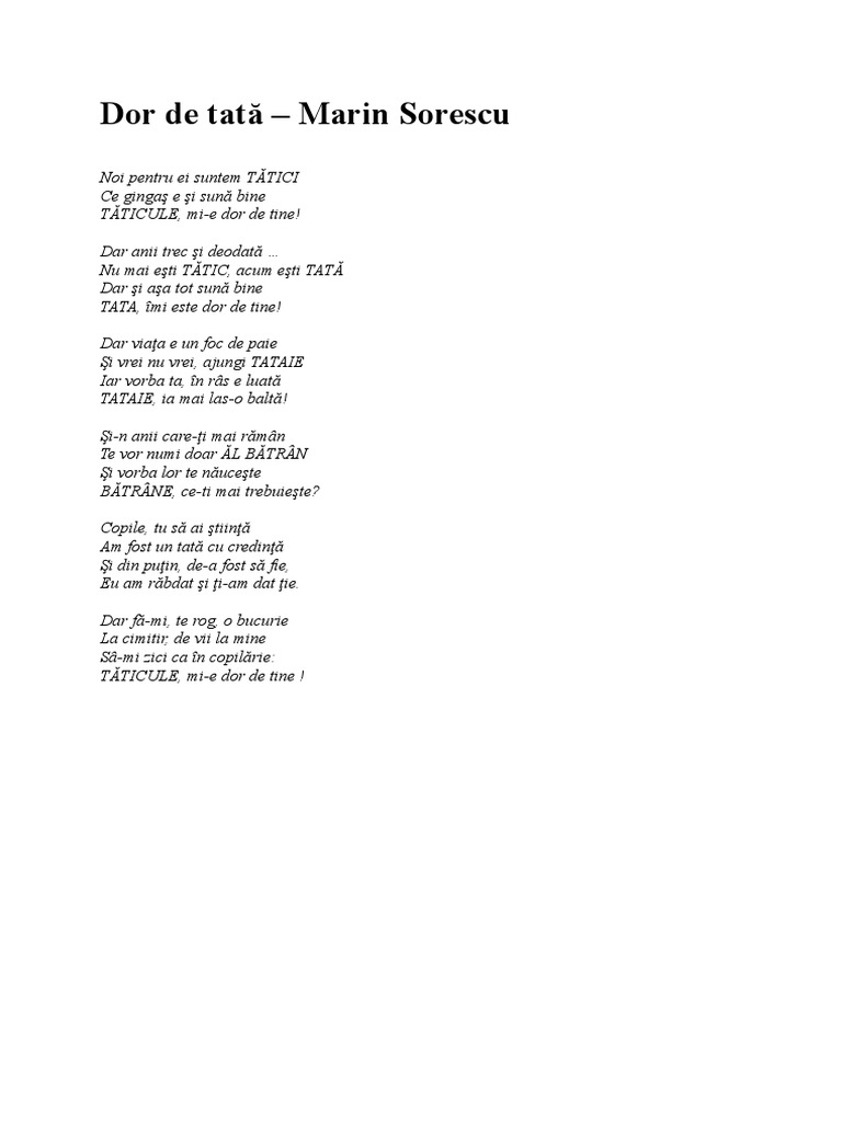 Poezie primită de la dl ioan roșca dor de tata când sunt copiii noștri mici noi pentru ei suntem tătici. Ce gingaș e și sună bine tăticule mi e dor de tine. Mi e dor de tine tata. Taticule de cind sunt mica foarte rar acasa i fost.