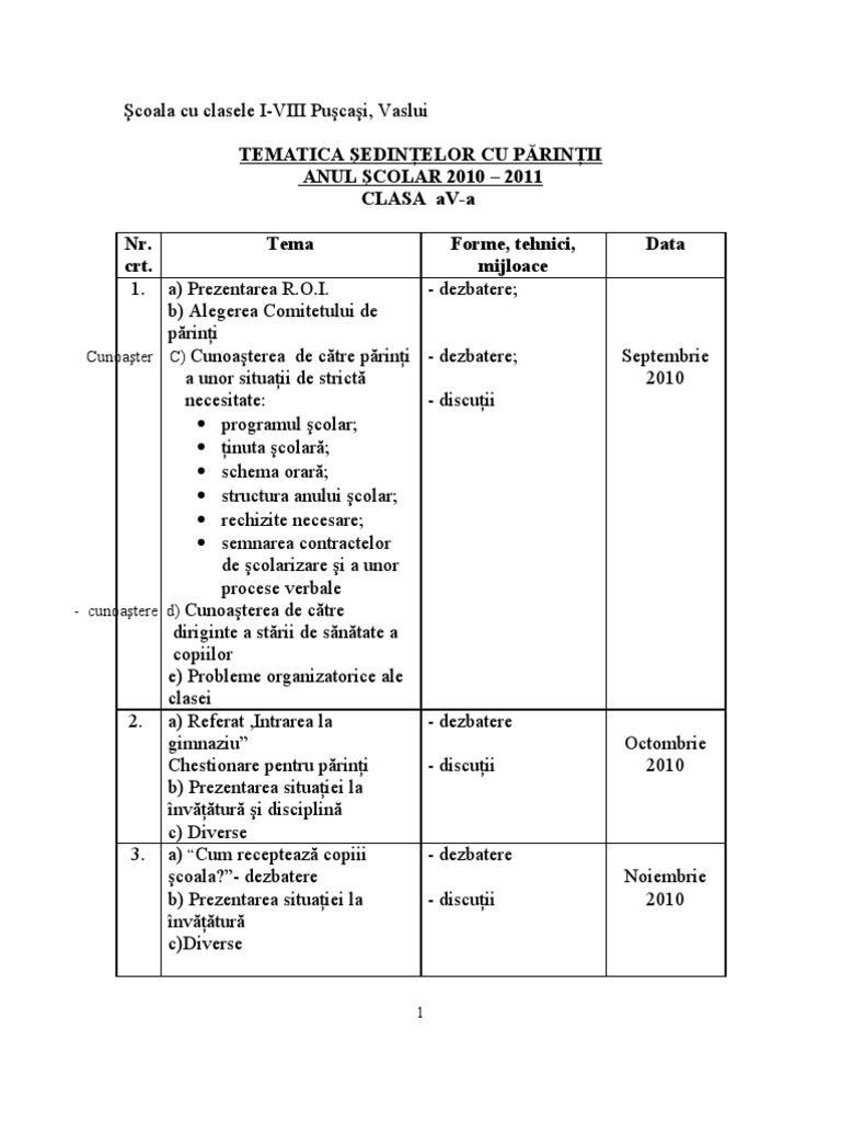 Tematica Sedintelor Cu Parintii Clasa A Viii A