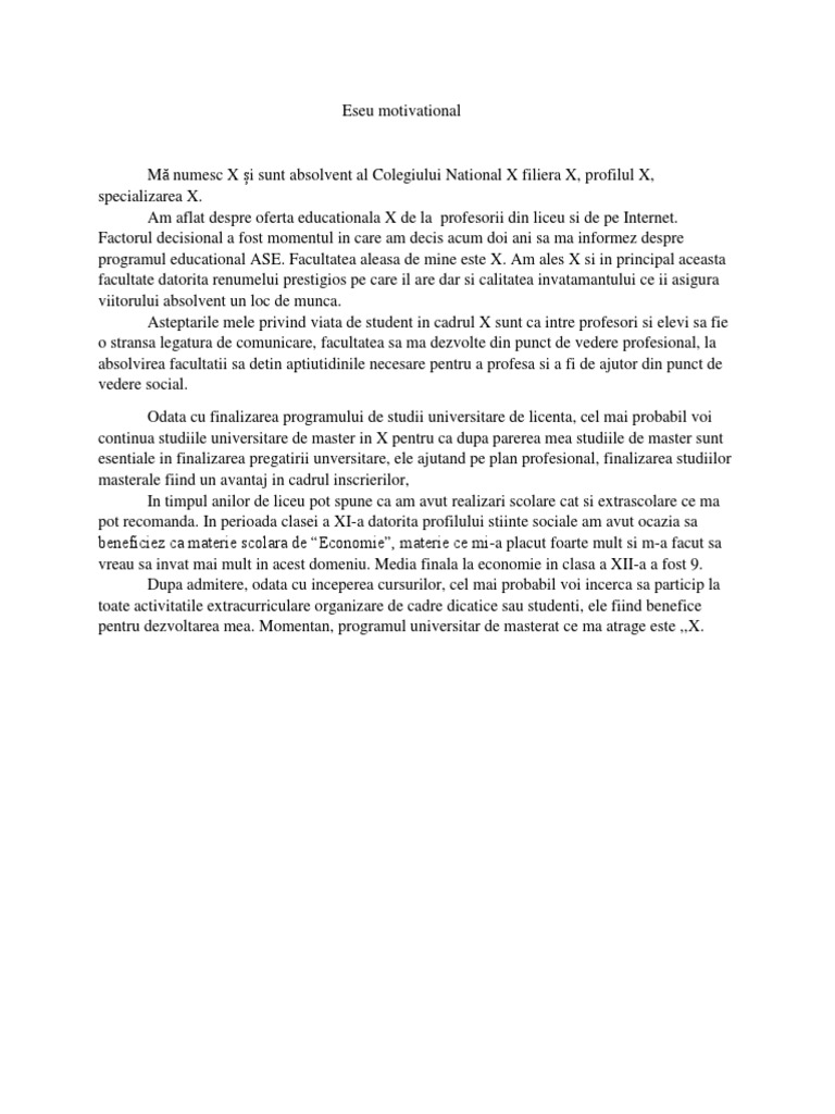 De gavrila cristina la 11 iul. Forma de invatamant cu frecventa if forma de invatamant cu frecventa redusa si la distanta ifr id. Eseul motivational pentru admitere la academia de studii economice bucurești în 2019 va fi redactat cu caractere times new roman 12 și va conține între 300 500 de cuvinte. înscriere facultăți locuri taxă.