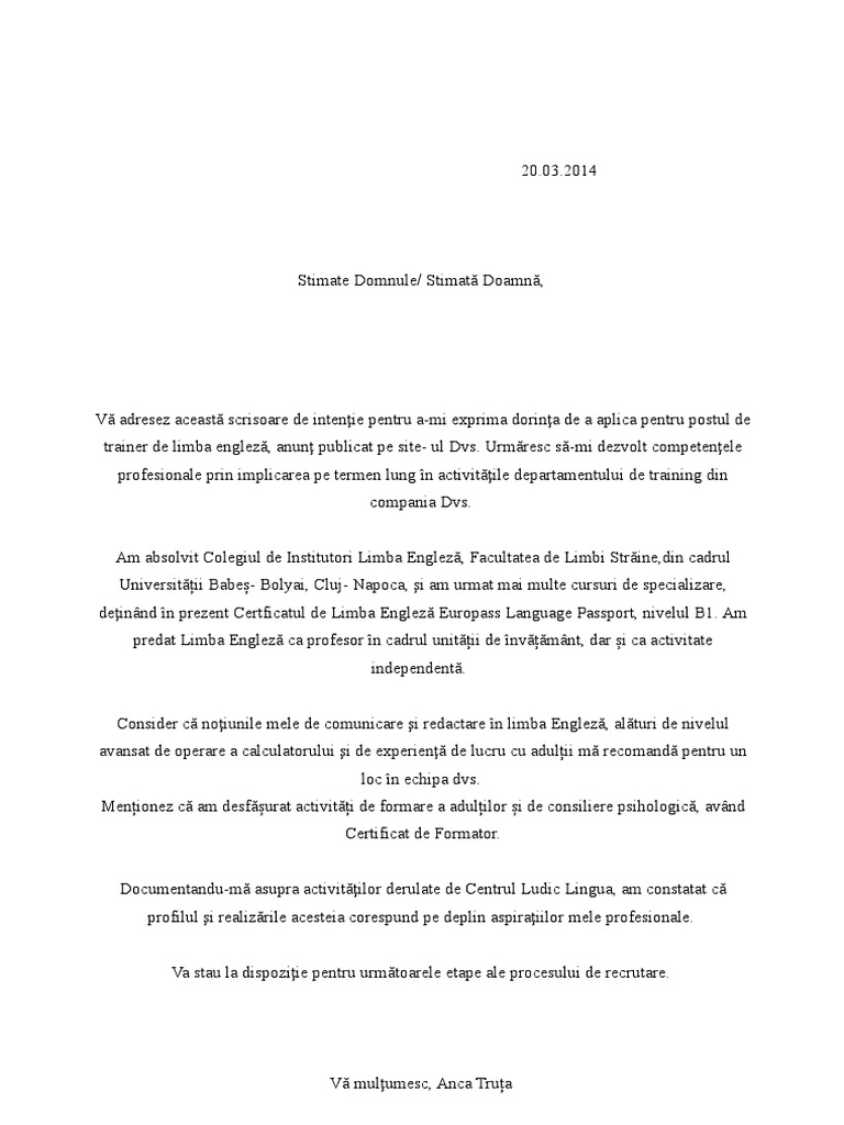 Scrisoare De Intentie Definitivat